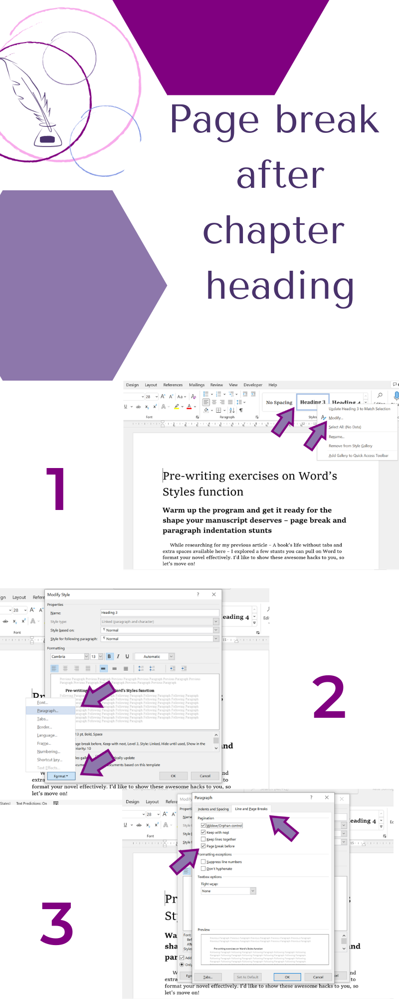 Why? Starting a new chapter on a fresh page is useful to create division and a nice flow for your novel. Also, assigning heading styles will give you and your editor an extra little tool to spot any problems through the Navigation pane.